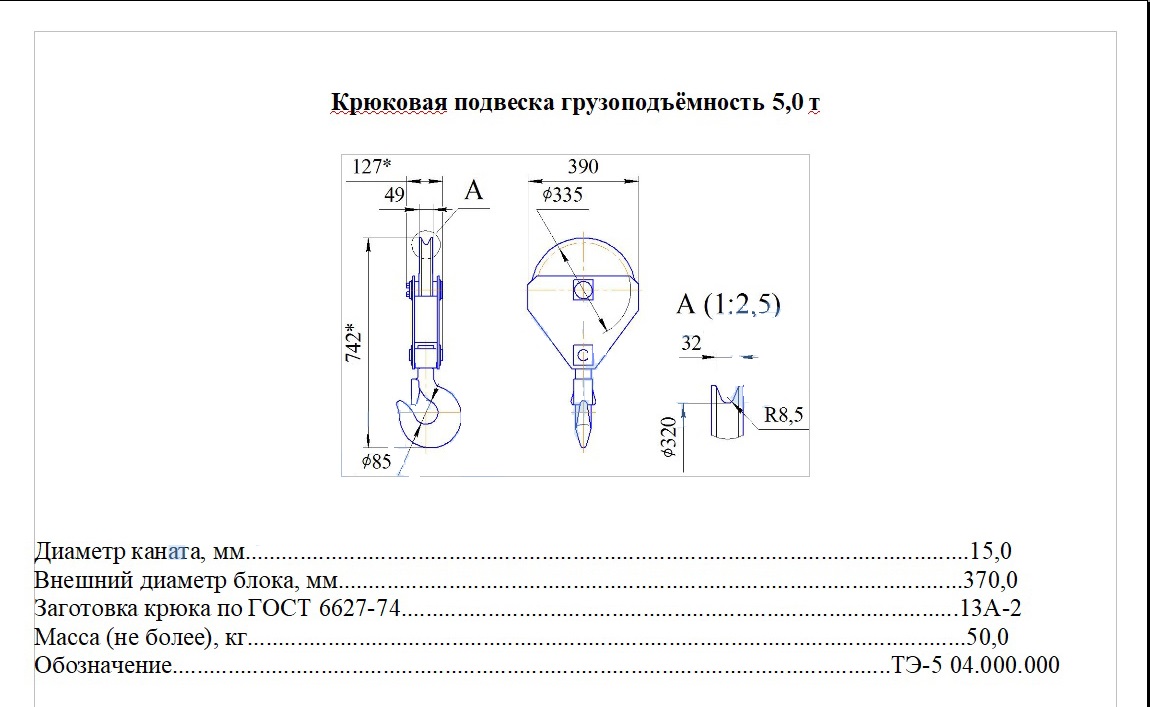 Чертеж крюковой подвески грузоподъемностью 5 тонн